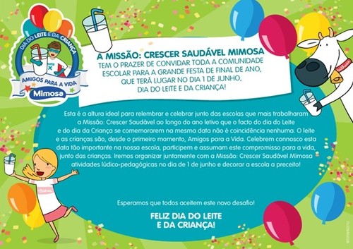 O Agrupamento de Escolas de Lajeosa do Dão e o programa educativo Missão: Crescer Saudável Mimosa têm o prazer de vos convidar para a grande festa do Dia Mundial da Criança, que terá lugar no dia 1 de junho, Dia do Leite e da Criança!