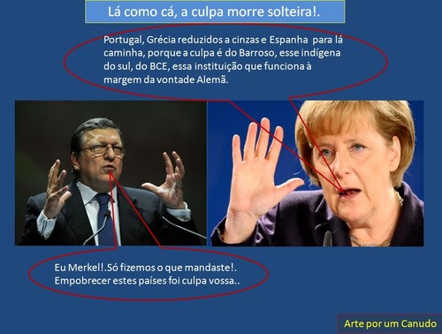 Merkel culpa Durão Barroso das medidas de austeridade sobre os países como Portugal e Grécia e até Espanha. Durão Barroso baixa as orelhas porque quer manter o cargo. Merkel diz que as medidas de austeridade nada tem a ver com a visão Alemã mas sim com a UE da qual Durão Barroso é Presidente. A culpa vai morrer solteira e estes politicos de elevada incompetência nunca vão ser responsabilizados por todo o mal e todo o sofrimento que provocaram às pessoas destes países.