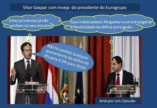 «Perguntou o jornalista se foi ou não foi pedido pelo Governo português para se discutirem nas próximas reuniões do Eurogrupo um ajustamento do défice do próximo ano de 4 para 4,5 por cento e se é esse o tipo de ajustamento que poderá vir a ser necessário.Dijsselbloem respondeu dizendo que não foi feito qualquer pedido de ajustamento.