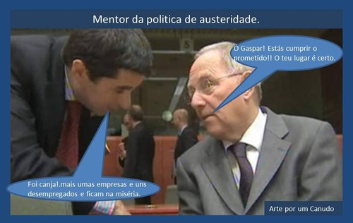 Vitor Gaspar, ministro das finanças português ouvindo conselhos do ministro das finanças alemão sobre como deve conduzir a politica portuguesa a nivel das finanças. Vitor gaspar comporta-se como sendo um bom aluno e parece prestar vassalagem ao ministro alemão o seu mentor e professor das politicas de austeridade com que vai fustigando o país.