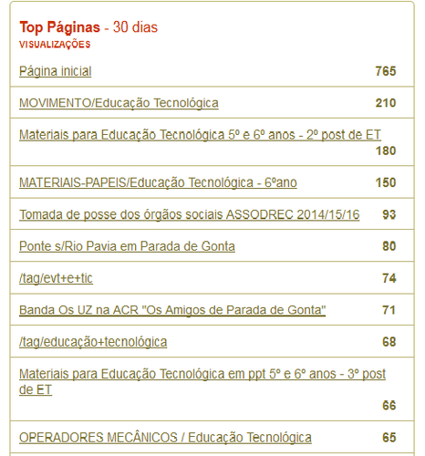 Os temas sobre Educação Tecnológica atualmente são os mais procurados seguindo-se os temas locais sobre noticias das atividades de Parada de Gonta. No Top 10 estão 6 posts relacionadas com Educação Tecnológica e 3 locais e 1 que é o mais procurado com o nome do blog.