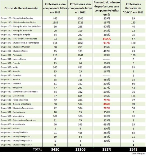 Os números foram retirados do blogue do colega José Marques, que refere que no total foram a concurso, "14854 professores sem componente letiva (13306 ainda sem componente letiva + 1548 retirados de concurso) ", não tendo sido considerados os colegas entretanto excluídos.